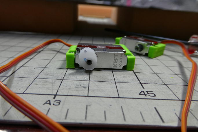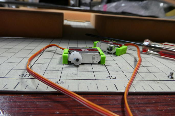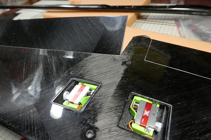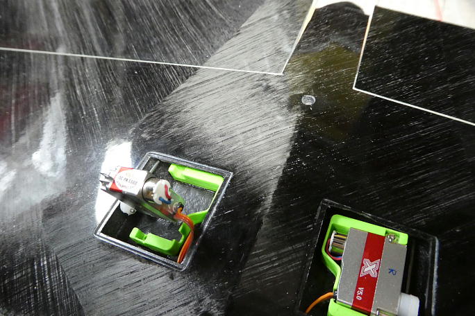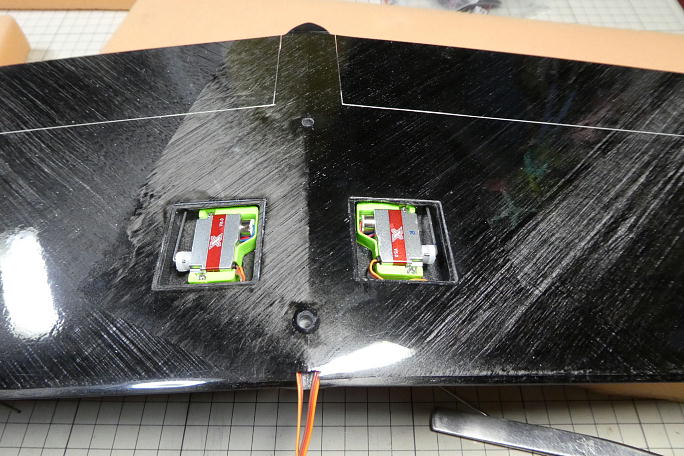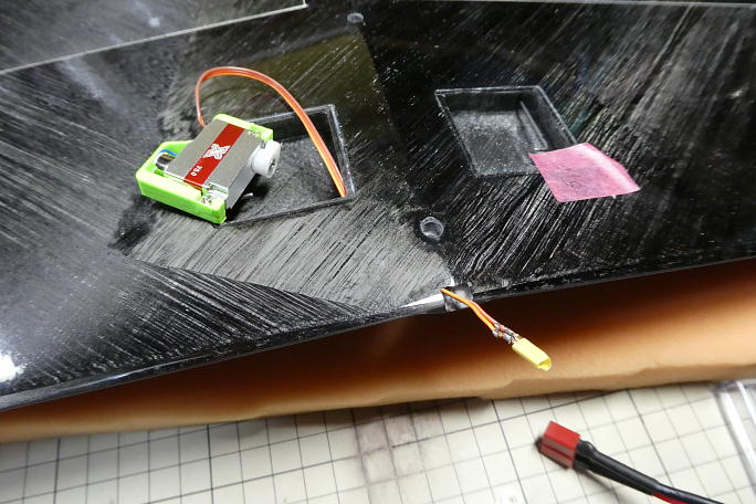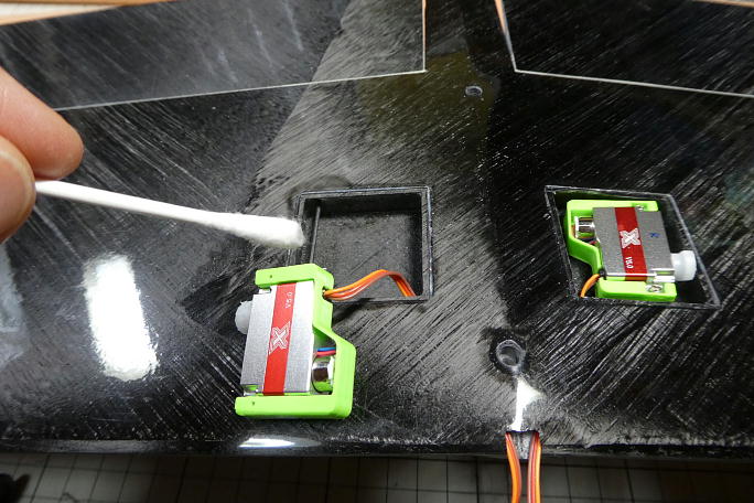 ![]() コネクターピンをハウジングを外して、コネクタを3本まとめてマスキングテープで巻いて、コードホールに通します。 引っかかる事無く出て来ました ![]() サーボホールの接着面とサーボベッドの接着面には綿棒に染みこませた硬化促進剤で良く拭いておきます。 ![]() サーボテスターでニュートラル信号、左1395μs、右1645μsでエルロンのニュートラルを確認、ついでに、サーボを 手で押さえて、ブレーキ動作の確認もしておきます。 位置が決まったら、高粘度瞬間接着剤で2〜3カ所、点付けで仮接着をします。 一気に接着してしまわないのは、 サーボベッドの厚みと死角になる部分の接着不良を懸念しての索です。 ![]() 仮接着の瞬間接着剤が硬化したら、サーボを一度外して、高粘度瞬間接着剤を全周に塗布して本接着とします。 ![]() 左右のサーボが接着されました。 白化が出ると面倒なので、しばらくはこの状態で放置です。 ![]() ブレーキも問題無く動作出来ました。 |