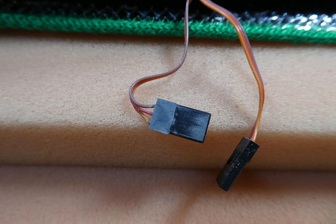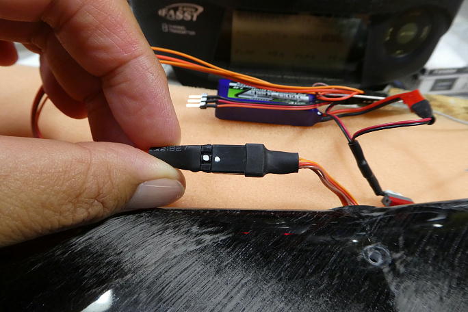 主翼のエルロンサーボのコネクタをまとめます。 メーカーで添付してきた受け側のハーネスは、2列のピンヘッダーを使用 していて、サーボのコネクタを二個重ねた物より若干上下の間隔が狭いのです。 サーボのコネクタの裏側に段差があり、その段差を削り取ると丁度良いピッチになるようです。 段差を削り取って、瞬間接着剤で貼り合わせます。 ![]() コードの付け根までシュリンクチューブで保護してあげました。 ![]() 極性を合わせてアイマークを入れました。 |