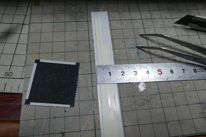 ![]() サーボカバーを加工します。 いい加減に切りっぱなしたFRP板が入っていました。 一辺はキッチリ直角になっていた ので、二辺だけマスキングテープでサーボホールを延長し、このマスキングテープのラインに沿ってFRP板をカット します。 角は軽く丸めておきます。 ![]() 両面テープを細く切って取り付け用にします。 太めの両面テープをカット台に貼り、その上にカットする両面テープを 貼ってから切り出すと、切った物を剥がすのが楽です。 ![]() 貼り付け完了です。 |