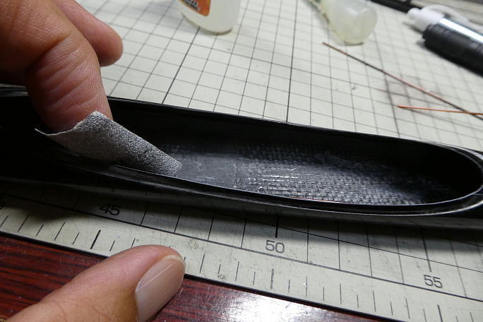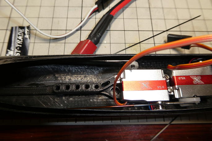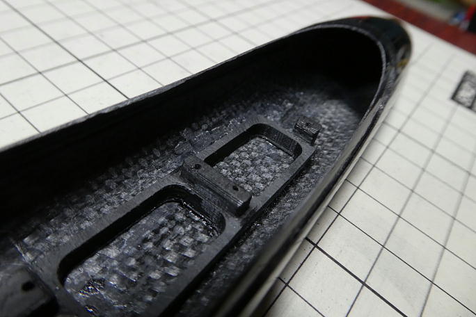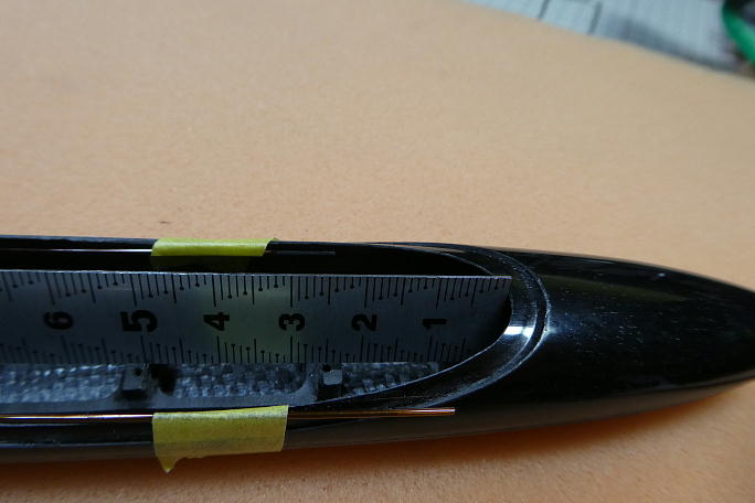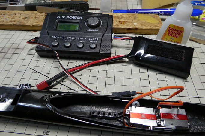 サーボにはサーボホーンを取り付けておきます。 サーボホーンはホーン自体がサーボ側に寄っている物を使用します。 穴位置は7ミリの所です。 ロッドエンドのピンに合わせて1ミリのドリルで穴を広げておきます。 ![]() サーボベッドの接着される部分をサンドペーパーで良くサンディングして、接着面を平滑にしておきます。 瞬間接着剤 で接着する時の接着強度を上げる策です。 ![]() 胴体のサーボベッド接着部分と、サーベッドの接着部分を硬化促進剤を染みこませたティッシュで拭いておきます。 ![]() サーボベッドに75グラムのバラストを取り付けて、胴体に挿入します。 胴体に開けられた、エルロンサーボのハーネス出し口が丁度前縁の位置です。 ここから覗いて、バラストにマーク した、バラスト自身の重心位置から63ミリのラインと重なる所でサーボベッドを接着します。 ![]() ラダーサーボ右とエレベーターサーボ左のサーボホーンと胴体とのクリアランスが均等な位置で、瞬間接着剤を2〜3滴 垂らして仮接着をします。 ![]() 一端サーボを取り外し、サーボベッド周辺に瞬間接着剤を流して本接着をします。 ![]() ![]() バラストホルダーまで瞬間接着剤が流れる様にします。 ![]() 接着後に計ったら、胴体開口部からサーボ耳までで23ミリとなりました。 |