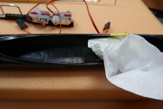 ![]() エレベーターリンケージ用のカーボンロッドにロッドエンドを瞬間接着剤で接着します。 ![]() ロッド自体にテフロンコーティングを施します。 ティッシュに液剤を染みこませて、良く拭き上げます。 ![]() サーボを1520μsのニュートラルで固定し、水平尾翼のニュートラルを合わせてカーボンロッドをカット、エレベーターサーボに 取り付けられたロッドエンドとカーボンロッドを接着します。 ![]() ラダーリンケージも同様に接着します。 |