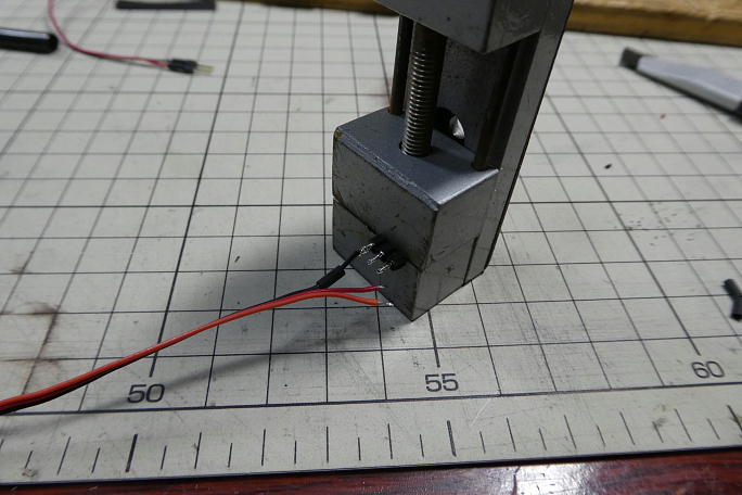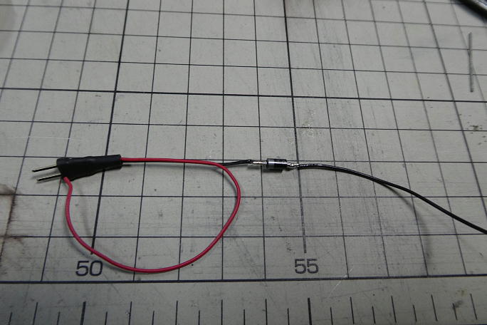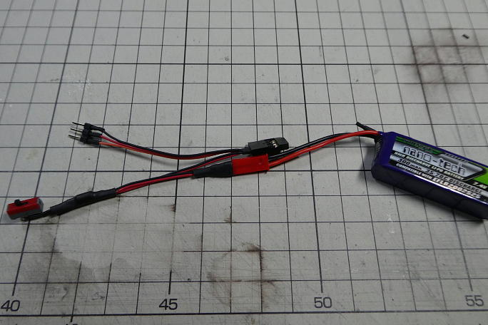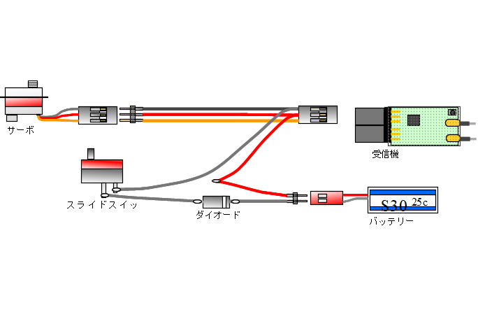 4CH受信機を使用しますので、1つのチャンネルポートから電源とサーボを分けるYハーネスを作ります。 メス側になるのはピンヘッダーで、ハンダ付けでコードを繋げます。 ![]() バッテリーコネクタもピンヘッダーです。 こちらには逆接防止とフル充電でも給電が8Vを超えないように、1個の ダイオードが入れてあります。 ![]() サーボ向けとバッテリー向けのコードをハンダ付けします。 ![]() スイッチをハンダ付けし、ハンダ部分周囲をマイクロバルーン入り5分エポキシを盛って絶縁と補強にします。 スイッチは小型のスライドスイッチです。 |