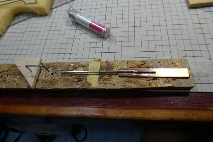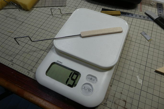 ![]() PROGRESSには、30グラム、50グラム、75グラムのバラストが付属します。 何回かフライトして、5m/s程度の 荒れた風の中を飛ばした時に、進入性には問題無かったのですが、もう一つ飛行に落ち着きが欲しいと感じました。 付属のバラストで一番軽い物は30グラムですが、もう一段階軽いバラストも必要と考え、製作することにしました。 付属のバラストは、真鍮の12ミリ×5ミリのフラットバーに2ミリのピアノ線が差してある構造です。 5ミリ厚の真鍮 に縦に穴を開けるのは難易度が高いので、違う方法で作る事にします。 ![]() PROGRESSでは、このピアノ線をキャノピーで押さえて固定しますので、正確に複製します。 ピアノ線は10ミリあたり0.25グラム、重りに用意した12ミリ×1.5ミリの銅フラットバーは10ミリあたり1.6グラムです。 ![]() ピアノ線の総長を200ミリ(5グラム)、銅フラットバーを85ミリ(13.6グラム)を用意しました。 ![]() ジグを作って、ピアノ線と銅フラットバーをハンダ付けします。 ピアノ線、銅フラットバー双方にフラックスを塗った状態で ピアノ線にハンダゴテを当てて、充分に加熱、ピアノ線と銅フラットバーの境目にハンダを当てて溶かし、流していきます。 ![]() ガタガタしないよう、厚みを合わせる為に3ミリバルサを貼って整形しました。 この状態で19グラム、狙った値です。 |