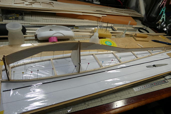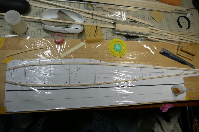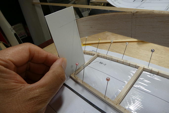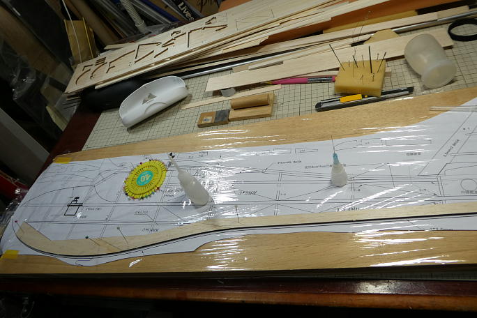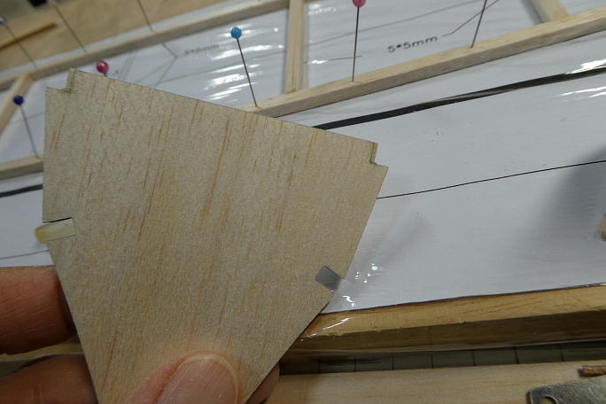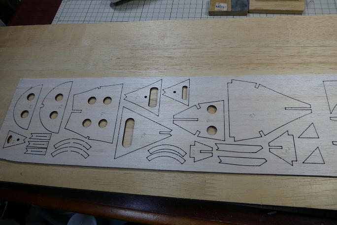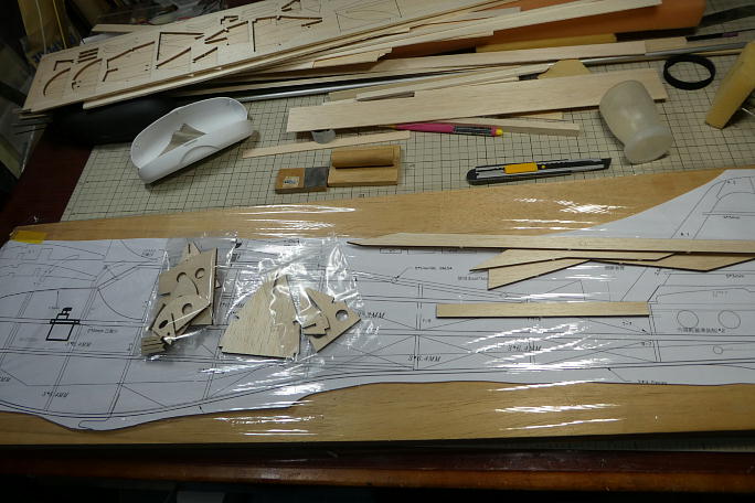 ![]() 胴体の胴枠などがあるシートです。 似たようなパーツが沢山あるので、図面とにらめっこの上、パーツにパーツナンバー を記入しておきます。 ![]() パーツをシートから切り離したら、部位毎に小分けしてビニール袋にいれておきます。 ![]() キール部分を組み立てます。 3分割されていますので、図面上で仮固定し、瞬間接着剤を流して組み上げます。 もし、フックなどを付けるのであれば、この時点で補強を入れるのが良いと思います。 ![]() 4*6ミリ材が入っていませんでした。 また、3*6.4も入ってません。 3ミリ材はシートの余白部分をそれ以外は手持ち のバルサから、丸鋸盤を使って切り出しました。 ![]() キールに胴枠を接着する位置をマーキングしておきます。 ![]() サイドのフレームになる部材の突き合わせになる部分を加工しておきます。 ![]() 機首部分にカーブのキツい所があり、その部分が無理なく曲げられるように、3ミリ程切れ込みを入れて起きます。 2ミリベニヤの切れ端をテンプレートにしてマイクロソーで切れ込みを入れます。 ![]() 胴体の平面図にサイドフレームをマチ針で仮固定します。 機首部分の切れ込みを入れたところは、この時点で 瞬間接着剤を染みこませて形状を固定しておきます。 ![]() 胴枠とサイドフレームの形状が合いません。 胴枠の方が幾らか小さいようです。 ![]() スクラップバルサを継ぎ足してつじつまを合わせます。 ![]() 桁と胴枠を接着、続いてキールも接着します。 ![]() サイドフレームからキールにかけて入れるトラス部材を簡単に作る為、ボール紙でテンプレートを作りました。 ![]() テンプレートに合わせてトラス材をカットします。 ![]() 桁の上にキールに向けたトラス材を接着していきます。 ![]() 側面ストリンガーもカーブのキツいところがありますので、切れ込みを入れておきます。 ![]() 側面材を接着しました。 |
