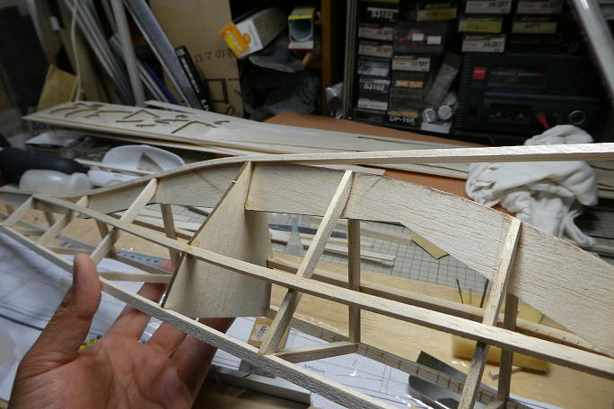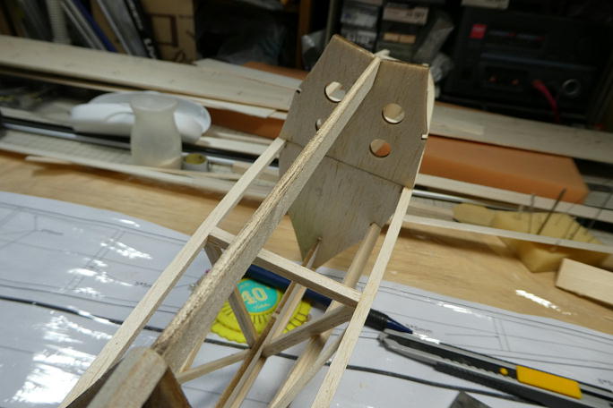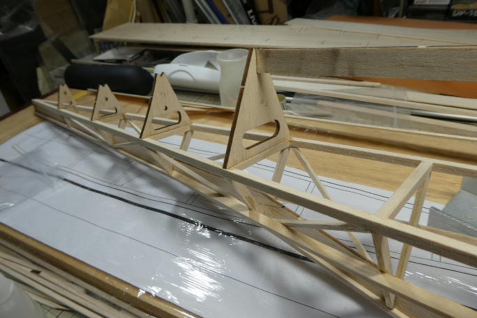 キャビン部分を組み上げます。 キャビンの胴枠を、底部の胴枠の上に接着、梁で後部の胴枠と連結します。 ![]() 後部胴枠を接着、写真にはありませんが、胴枠の上に5×5ミリバルサを乗せて接着、背骨になります。 ![]() 主翼台の梁は、この部分で上反角を受けるので、真ん中をへこませるようにサンディングしました。 ![]() 主翼台の突き合わせ部分も上反角に合わせて削ります。 ![]() ![]() 主翼台も3ミリバルサ一枚で、実際に主翼を乗せて見たら左右方向にグラグラと揺れるので、キットにはありませんが 柱をを左右一本ずつ追加しました。 ![]() 3×3ミリバルサが枯渇したので、端の余った所で作りました。 ![]() 作った3×3みりバルサで側面ストリンガーを入れます。 ![]() ストリンガーと側面キールの間にトラスを入れます。 トラスは一本ずつ角度を合わせつつ接着していきます。 かなり時間がかかり、めんどくさい作業ですが、出来上がりを見ると苦労も吹っ飛びます。 |