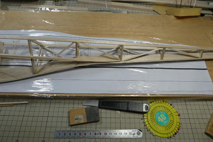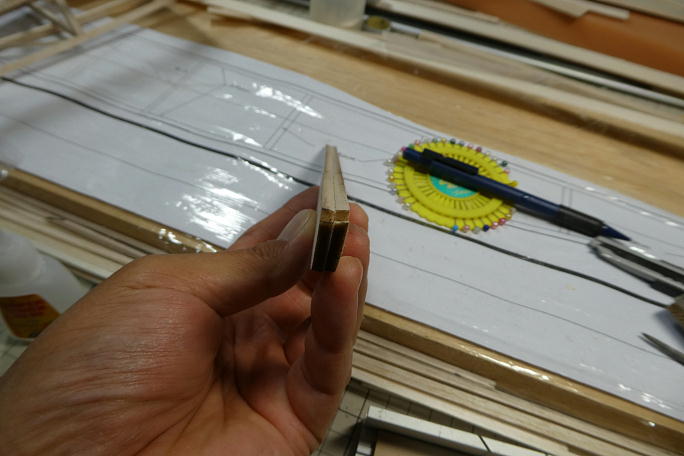 ![]() 底板を貼る準備でキールとトラスのツラを削って平らにします。 ![]() 3×8ミリバルサを底部に接着します。 これまで3ミリバルサ一枚だったキールがT構造になり、全体的にとても丈夫に なります。 ![]() 図面では一本線でしか書かれていないのですが、キット製作者のLIUさんの指示で3×3ミリバルサでトラスを入れます。 ![]() トラスが入れ終わりました。 フイルムが貼られる部分と貼られない部分が出て来ました。 |
