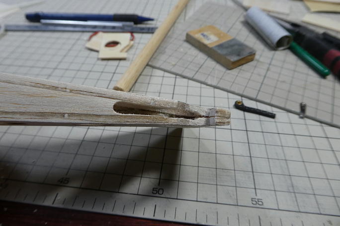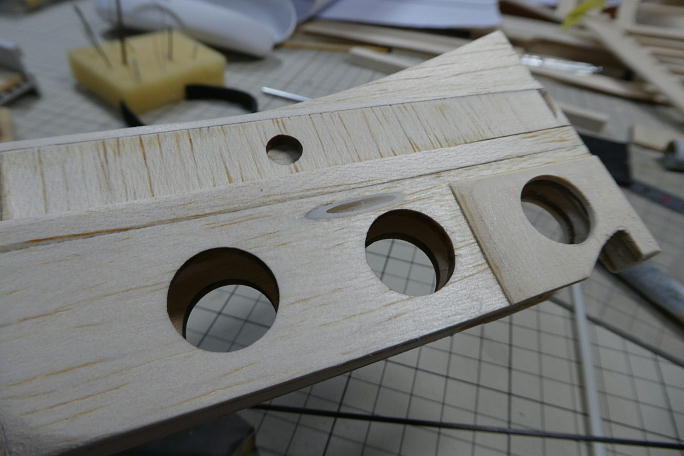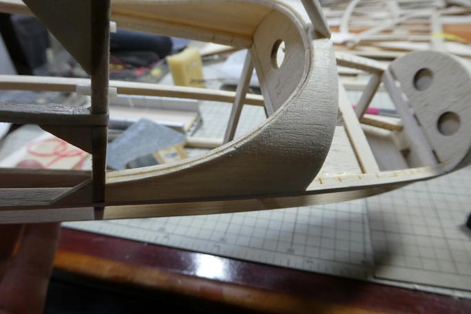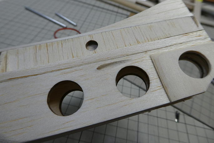 ![]() カーボン製のエレベーターホーンがこのスペースに入りますが、ホーンはともかく、クレビスのスペースがありませんでした。 ギリギリまで削ってクレビスの入るスペースを確保します。 ![]() 限界まで削ってしまったので、補強に2ミリベニヤをあてがう事にしました。 ![]() 胴体後部と同じ形に切り出した2ミリベニヤを接着、回りと馴染む様に成型します。 ![]() ラダーのコントロールロッドの取り出し口を加工します。 樹脂のチューブを埋め込み、そこからカーボンロッドのロッドを 取り出します。 ![]() チューブを埋め込み、瞬間接着剤で接着します。 ![]() 回りをマスキングテープで養生をして、チューブと胴体がツライチになるように整形します。 フイルムも貼りやすくなります。 ![]() 成型が終わったラダーリンケージの取り出し口です。 ![]() 付属の樹脂パイプをカットして、胴体内部のリンケージロッドの踊り防止にします。 ![]() 見えにくいですが、リンケージロッドを通した状態で、要所に切っした樹脂パイプを接着します。 |
