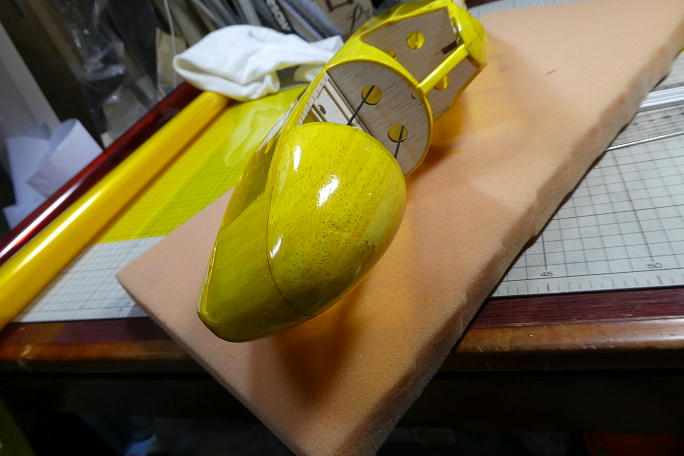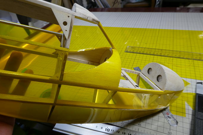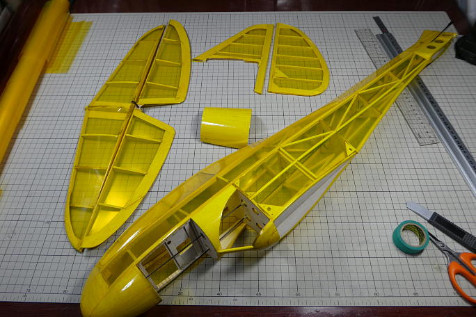 ![]() フイルムを貼ります。 なぜかキットにフイルムが付属していますので、そのフイルムを使用します。 水平尾翼、垂直尾翼 はそれほど難しくはありません。 通常の機体と同様に貼っていきます。 ![]() 胴体は複雑な形状をしていますので、細かく分割して貼っていく事になります。 先ずは胴体後部のフィレットを貼ります。 ![]() 次にキール部分を貼っていきます。 ![]() 形状に合わせてカットするのは難しいので、大まかに切ったフイルムを胴体に仮止めし、軽く点付けした後不要部分を 切り取ります。 全体にアイロンを当て、更にトリミングして一枚目が貼り終わりです。 ![]() キャノピーの回り込みもコテを使って貼っていきます。 ![]() この段階でリンケージロッドを通していきます。 これ以上貼り進んでしまうと、リンケージに直接アクセス出来なく なるからです。 ![]() ![]() ノーズ部分は4分割で貼っていきます。 ![]() 胴体のフイルム貼りが完了しました。 二日ほど要してしまいました。 |