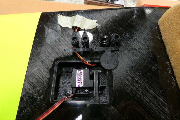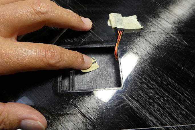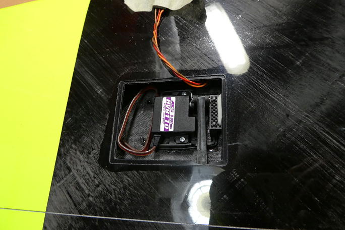 ![]() マスキングをして、主翼下面とサーボベッドの間にマイクロバルーン入り5分エポキシを充填して下面スキンと サーボベッドを固定します。 ![]() マスキングを剥がした状態です。 ![]() サーボを取り付けてエルロンサーボの施工は完了です。 |