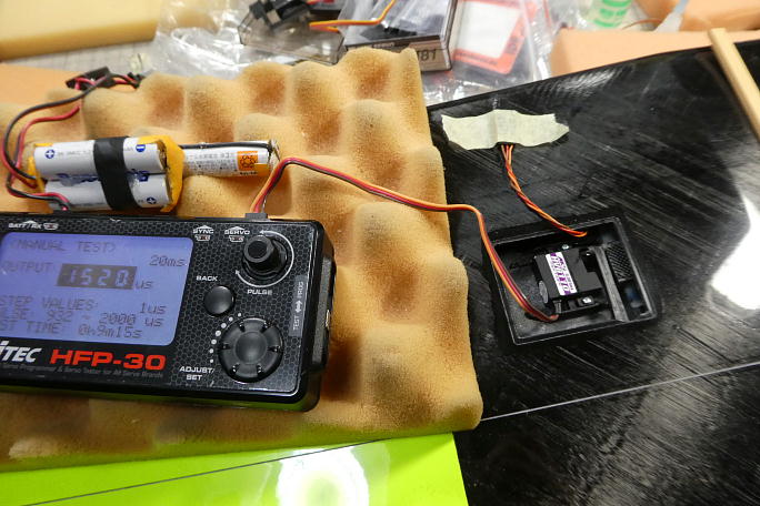 ![]() エルロンサーボの施工に入ります。 エルロンサーボはMKSのHV6110です。 サーボホールに収まる最大のサーボ ホーンを見付けます。 こちらは中間のサイズが入りそうです。 ![]() サーボをサーボベッドに固定した状態で、サーボベッドの面出しを行います。 サーボベッド全体にサンディング痕が 付くように削ります。 削れちゃいけない所まで削れています。 ![]() サーボホール内の接着部分のサンディングを行い、接着部分を平滑にしておきます。 ![]() 清掃も兼ねて、サーボボールの接着部分を硬化促進剤を染みこませたウエスで拭いておきます。 ![]() エルロンは1520μsでニュートラルを合わせて、サーボベッドの四隅に一滴ずつの中粘度瞬間接着剤で借り固定を します。 瞬間接着剤を入れたら、直ぐに硬化促進剤(ボブスミス)を垂らして硬化させます。 ![]() サーボを一度取り外し、サーボベッドの周囲全てに中粘度瞬間接着剤を流し、直ぐに硬化促進剤(ボブスミス)を流して 硬化させます。 自然硬化に任せると、主翼上面に歪みが出てしまう事があるからです。 硬化時の発熱によるものなのか、ロハセル に瞬間接着剤が染みこんで硬化するせいなのかは謎ですが。 |