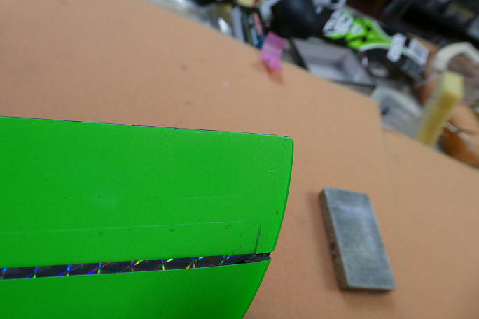 ![]() 付属するカーボン製のサーボカバーはサーボホールのサイズにジャストフィット。 加工の必要が一切ありませんでした。 ![]() シャープに仕上がっている翼端ですが、取り回しなど運用面を考えて角を丸く落としておきます。 |