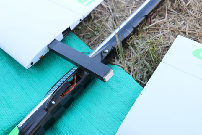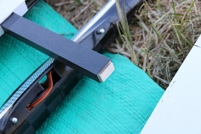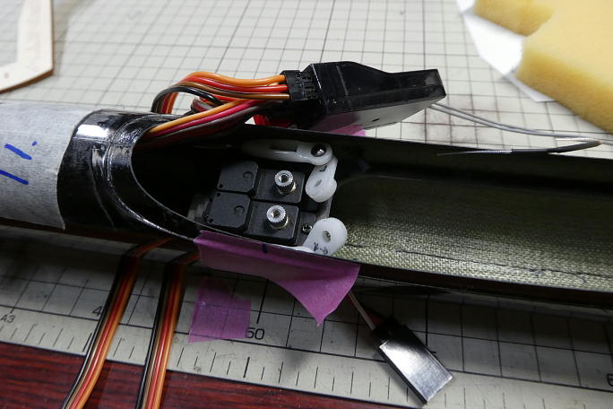 ![]() 受信機が入るギリギリまでサーボを下げたのですが、サーボホーンの嵩まで考えていませんでした。 後でやっている内に、サーボホーンを外さなくても受信機を出し入れ出来る角度を見付けましたが、この時点では サーボホーンを外してから受信機を入れています。 ![]() 受信機が入ったので、アンテナ線の取り出しの確認をしています。 |