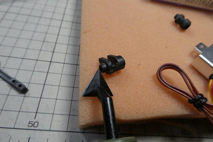 ![]() 右が付属のポジドライブ規格のネジで左が通常のネジです。 この時点で、手元にポジドライブのドライバーが無く、上手に 締められなかったので手持ちの通常のタッピングネジに変更しました。 ![]() サーボホーンのベアリングに挿入される部分がスムージに入る様に成型します。 ![]() ニュートラルを合わせてサーボホーンを圧入します。 このホーンは取り付けねじを使用しませんが、その分、もの凄く挿入 が固いです。 覚悟が必要です。 ![]() サーボベッドを接着する部分を良くサンディングしておきます。 表面には何が乗っているか判りませんし、デコボコしている と接着不良を起こします。 ![]() 接着面の掃除を兼ねて、硬化促進剤を染みこませた綿棒で拭いておきます。 ![]() サーボのニュートラルと動翼のニュートラルを合わせて、サーボベッドの四隅、もしくは動かない最小限だけ低粘度瞬間接着剤 でサーボベッドを接着します。 直ぐに硬化促進剤を一滴ずつ垂らして固めます。 ![]() サーボを一度取り外し、サーボベッドの全周囲に中粘度瞬間接着剤を流し、硬化促進剤で固めます。 硬化促進剤の使用が遅くなったり、使用しなかったりすると、心材のロハセルが引けて、表面に跡が出てしまいます。 |
