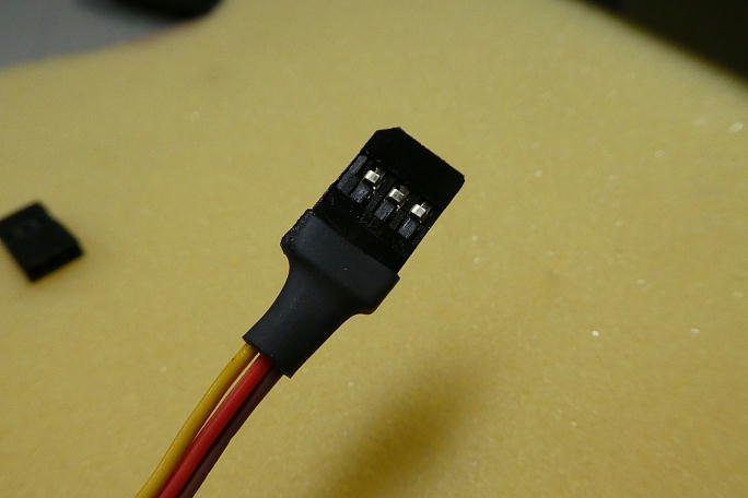 ![]() サーボを取り付けます。 サーボには取り付けねじ部が三カ所ありますが、スペースの都合で取り付けねじは二本で 済ませます。 ネジは付属のポジドライブではなく、通常の2.6oタッピングネジを使用します。 ![]() エルロンサーボのサーボコードは延長しなくても届く距離なので、そのまま使用しますが、コネクターはJRタイプの物 です。 センター翼との接合部分には、向きの判りやすいフタバタイプを使いますので、コネクターハウジングを取り 替えます。 ![]() 抜き差しを考えてシュリンクチューブで保護しました。 サーボカバーは透明の塩ビ板をバキューム成型した物が付属しますが、サーボホーンが主翼下面から出っ張り ませんので、平らな部分を使用し、両面テープを細く切った物で貼り付けます。 |