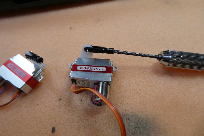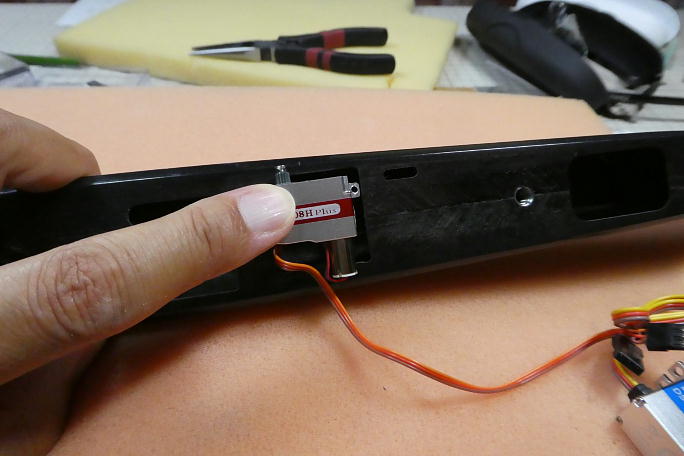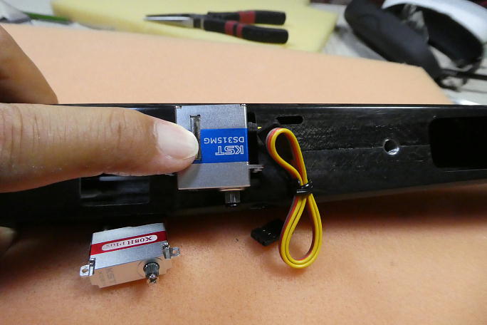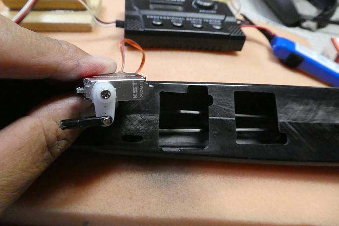 ![]() 胴体のサーボ取り付けです。 Explorer3タイプの胴体はサーボの取り付け方法でいくつかタイプがあり、今回の 物は胴体の背中にサーボを乗せ、センター翼に半没する形になるタイプです。 サーボは横積みになりますが、サイズが限定されます。 MKSの6000シリーズを想定して取り付け穴がある程度 加工してありますが、手持ちのサーボでなんとかする方向で進めます。 ![]() KSTのDS315は論外で入りません。 主翼側を削れば入るでしょうが、主翼には手を付けたくありません。 X08でも良さそうですが、エレベーターへの使用には少し不安があるので、モーターを強化したX08Pulsを使用 する事にしました。 それにしてもギリギリまで切り欠きを大きくする必要はあります。 ![]() サーボホーンが内側になる物を付けて干渉しないように広げます。 左側が加工済み、右側は未加工です。 この様にサーボが収まります。 サーボは1.7oのタッピングねじで取り付けます。 ![]() スペースの関係で調整機構は省きます。 MP−JETの樹脂クレビスは瞬間接着剤が効きますので、リンケージ のカーボンロッドをクレビスに直に接着します。 クレビスの穴を2oのドリルで広げておきます。 ![]() ![]() ロッドの長さを決めて切断、先端の接着部分を良くサンディングしておきます。 ![]() ニュートラルを合わせて、サービスホールから瞬間接着剤を流してリンケージロッドとクレビスを接着します。 |
