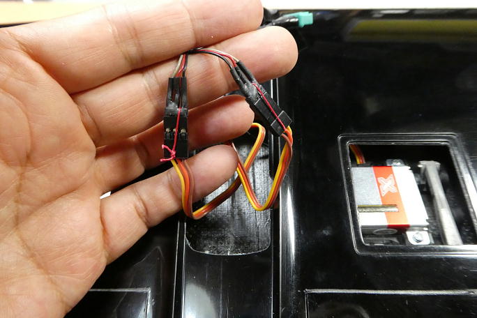 ![]() ハーネスです。 今回の胴体は、D−SUB9ピンの指定がないので、MPX6ピンコネクターを使用します。 コードは30AWGです。 ![]() フラップサーボとハーネスの抜け止めにはPEラインで縛って、瞬間接着剤で固めています。 |