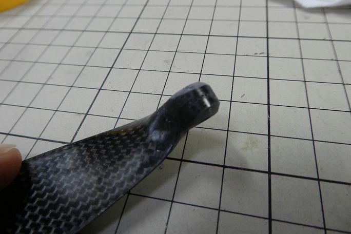 ![]() キャノピーラッチは2oカーボンロッドで、瞬間接着剤で仮接着したのち、マイクロバルーン入り5分エポキシを盛って 固定します。 写真は1カ所しか写っていませんが、前後2カ所に施工しています。 ![]() 先端は掛かりやすいように丸め加工をしています。 ![]() RFMのプロペラはハブによっては干渉してしまうので、この部分を削ります。 |
