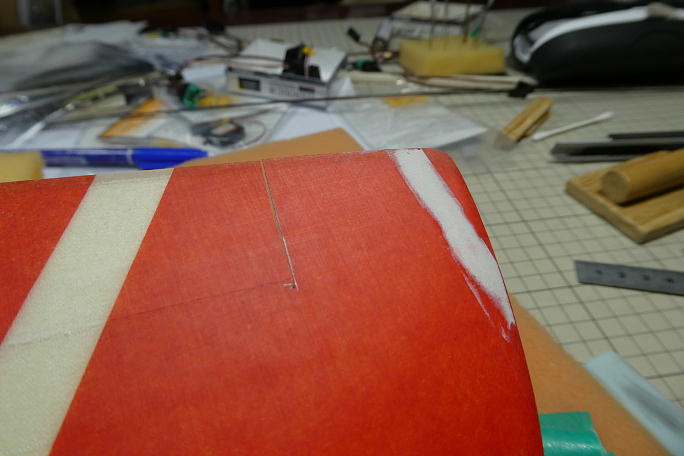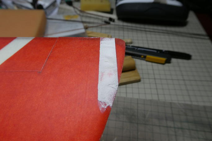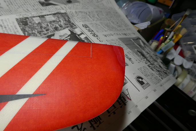 2機同時に製作します。 ![]() 2機の内1機の翼端にシワが入っていました。 白化していないので、生産時の、もしくは型から出した直後の 物かと思われます。 水アイロンで修正してみました。 凹みは残りましたが、後縁は一応伸びた感じになりました。 ![]() 軽量パテを盛ります。 水性なので、夏場でしたが二日は乾燥させています。 ![]() ![]() 他を削ってしまわないようにマスキングテープで養生して、ツライチになるように削ります。 ![]() プラモデル用の水性カラーをエアブラシで吹いて着色しました。 |