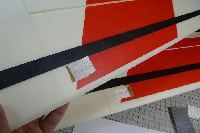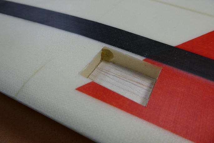 ![]() エルロン、フラップサーボにはTahmazoのTS1002を使いますが、主翼下面とツライチにしたいので1.5oバルサ を1.3oまで削って薄くした物をサーボホールに5分エポキシで接着します。。 接着されたかさ上げ用のバルサです。 ![]() サーボホール内壁でサーボを保持する工法ですので、サーボホール補強の為に、5052にカーボンパウダーを 混ぜた物を筆で塗りつけます。 |