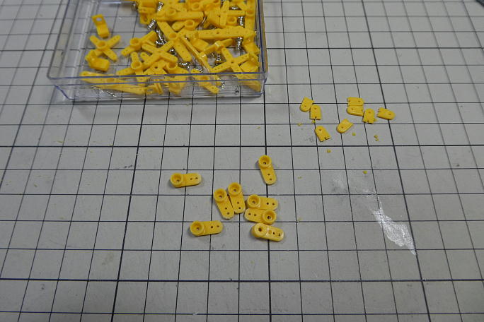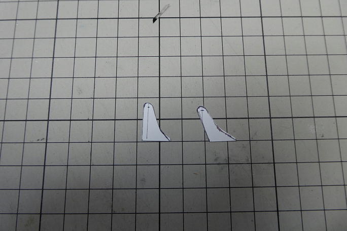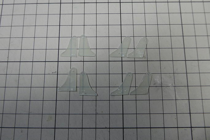 ![]() エルロンホーンとフラップホーンを切り出すために型紙を作りました。 左がエルロンホーン、右がフラップホーン です。 ![]() 1oFRP板から、2機分まとめて切り出します。 ![]() サーボホーンも2機分まとめて不要部分の切り落としと成型を済ませておきます。 |