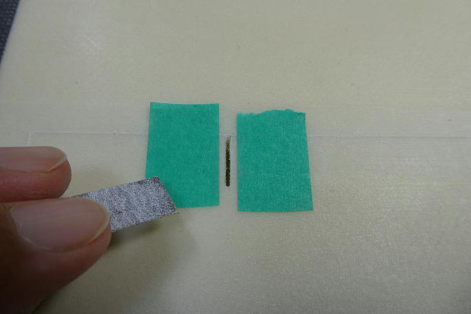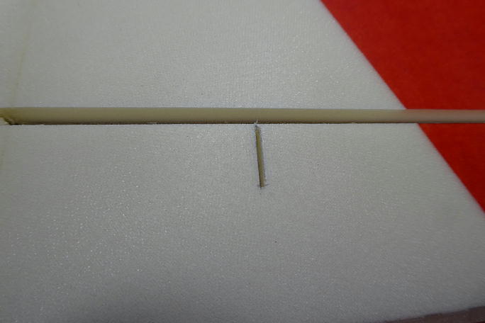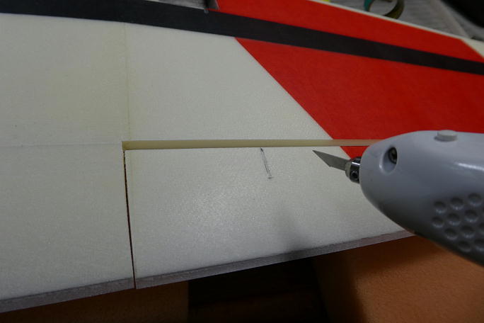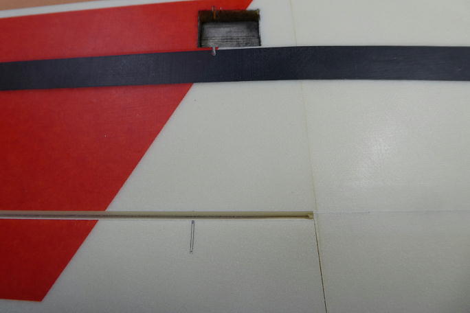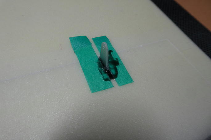 ![]() サーボを仮止めして、リンケージラインを想定、ホーンを取り付ける位置を決めます。 リンケージロッドの曲げ部分 の、ホーンの穴に入りきらない部分も考慮します。 ![]() エルロンホーンの取り付け位置です。 ![]() フラップホーンの取り付け位置です。 ![]() 表皮を超音波カッターで切り取ります。 ![]() カットの終わったホーン取り付け部分です。 ![]() 接着と同時にフィレットを形成するため、ホーン取り付け部分から3o離してマスキングテープを貼り、周囲をサンディング して足付けとします。 ![]() ホーン取り付け穴から2o離してマスキングテープを貼り直し、カーボンパウダー入り5分エポキシを取り付け穴内に 充填します。 ホーンを押し込んでから、はみ出たカーボンパウダー入り5分エポキシを均してフィレットにします。 マスキングテープは工程が終了したら直ぐに剥がしてしまいます。 そのままにしておくと、マスキングテープの境目で 段差が出来てしまいます。 |
