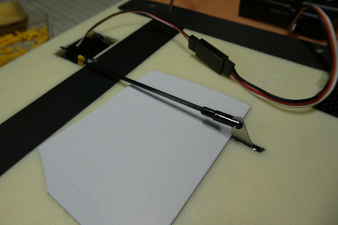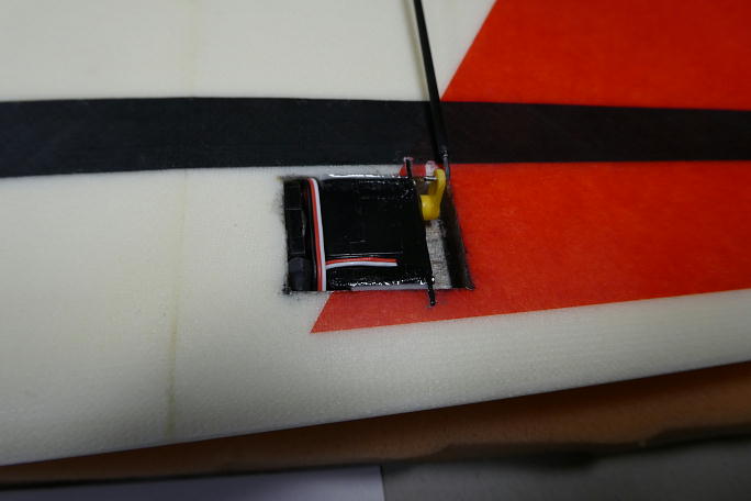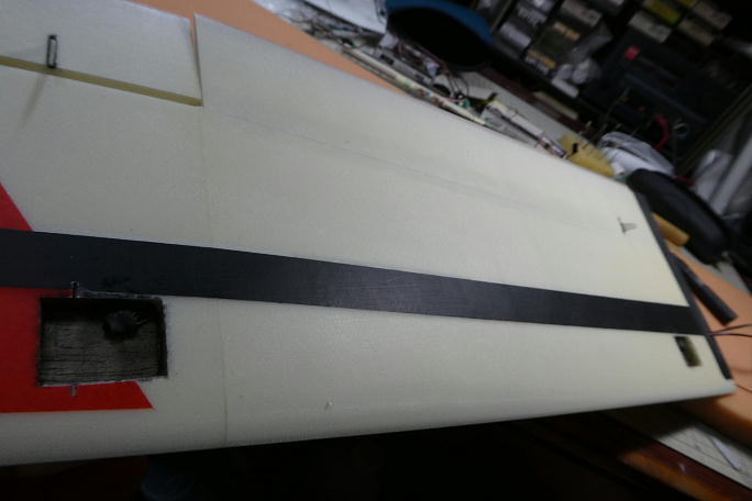 ![]() バタフライの動作角を確保するため、フラップサーボはサーボテスターで140μs分オフセット。 それに加えて、 サーボホーンを1ノッチ分オフセットします。 ![]() リンケージロッドのカーボンパイプとクレビスとの接着部分をサンディングしておきます。 ![]() サーボテスターでニュートラルを合わせて、クレビス側で動翼のニュートラルを調整、クレビスとリンケージロッドを 瞬間接着剤で接着します。 瞬間接着剤を垂らしてしまう事を懸念して、ボール紙を敷いて養生とします。 ![]() サーボをサーボホールと接着する部分に足付けをするのを忘れていました。 サンドペーパーを貼り付けたスクラップ バルサを使って足付けをします。 ![]() 主翼側をマスキングテープで養生して、マイクロバルーン入り5分エポキシをサーボホールとサーボの間に充填します。 ![]() 充填が完了しました。 この接着面積で充分サーボは固定されます。 |