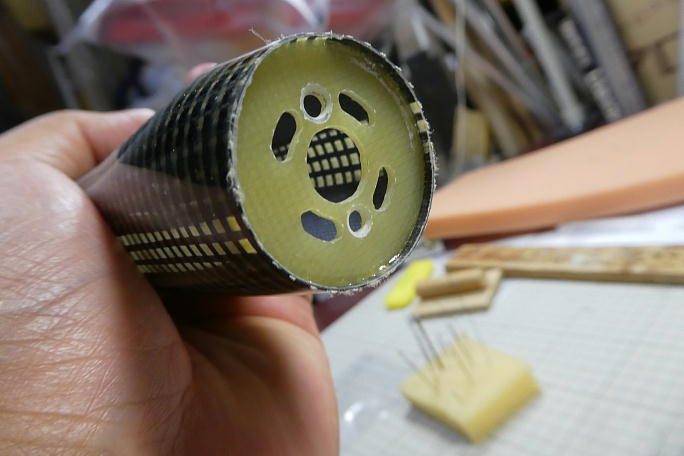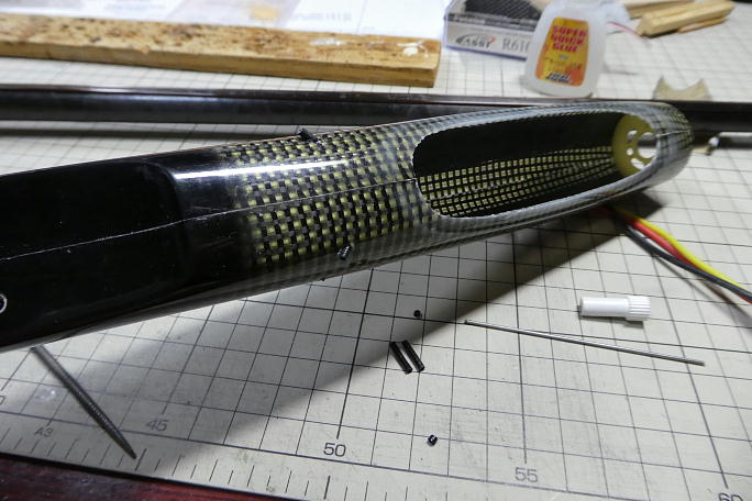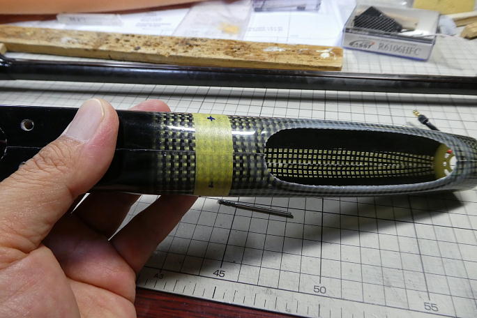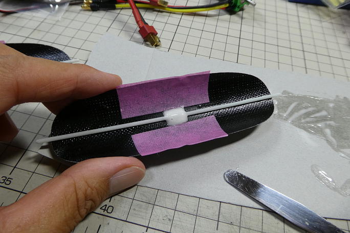 ![]() アンテナ線の取り出し口を加工します。 受信機からのアンテナ線の届く位置で、機体の影になりにくい位置を選んで マーキングをしました。 ![]() アンテナ線のリードパイプにはエンパイアチューブを使用しました。 チューブの中にピアノ線を入れて、センターから 45°、二本のアンテナ線の間隔が90°になるように瞬間接着剤で接着します。 |