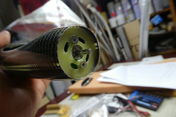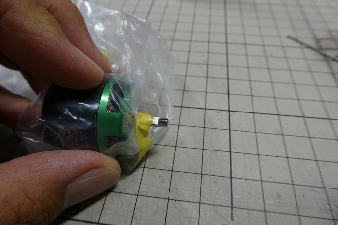 ![]() モーターはネジ二本止めで固定します。 取り付けねじが皿ネジなので、マウントのネジ穴には皿加工を施しました。 モーターの配線が斜め下に出るような角度で穴を開けています。 ![]() 仮組をしたらスピンナーの取り付けイモネジの位置が随分と前の方でした。 シャフトのDカットが短かったので削り足し をします。 削った鉄粉がマグネットに付いてしまわないように、ビニール袋で養生をして加工します。 ![]() リューターの丸砥石で削って、平ヤスリで仕上げました。 ![]() モーターを取り付けました。 |