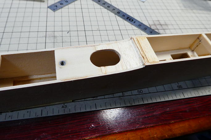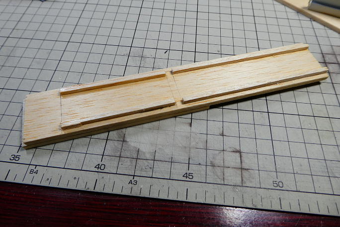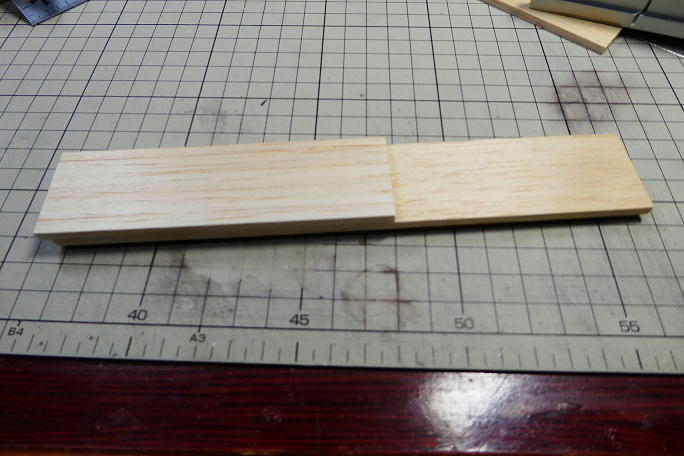 ![]() 前側主翼取り付けねじ受けと側板との段差にスクラップバルサを貼って、段差を均します。 |