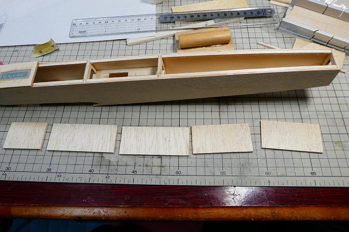 ![]() 下面フランクは3ミリバルサですが、ストックの中からデスクライトの光がほとんど透けない、目の詰まった物を選びました。 地面に下ろしてもキズが付かないようにです。 固い部材はどちらかというと、柔らかい部分を取った残りになりますので、在庫一掃になりました。 ![]() 幅を揃えて、タイトボンドでつなぎ合わせ、一枚のシートにしました。 ![]() 胴体内部から瞬間接着剤を流して下面プランクを接着します。 ![]() はみ出たプランク材をザックリと削り落とします。 通常のバルサなら、スーッとカッターを滑らせるだけで切れますが、 さすがに固いバルサだけあって、ガリガリと削らないと削れませんでした。 |