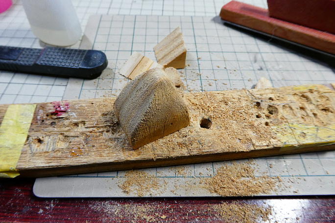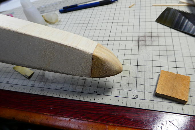![]() 積層しておいた桐材を整形します。 ノコギリで大まかに形を作ってから、鬼目ヤスリで整形していきます。 ![]() 胴体に接着、全体のラインと合わせるように整形します。 ![]() 大まかにですが、全体を削って形を整えます。 |