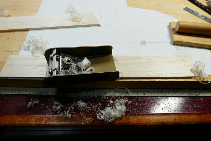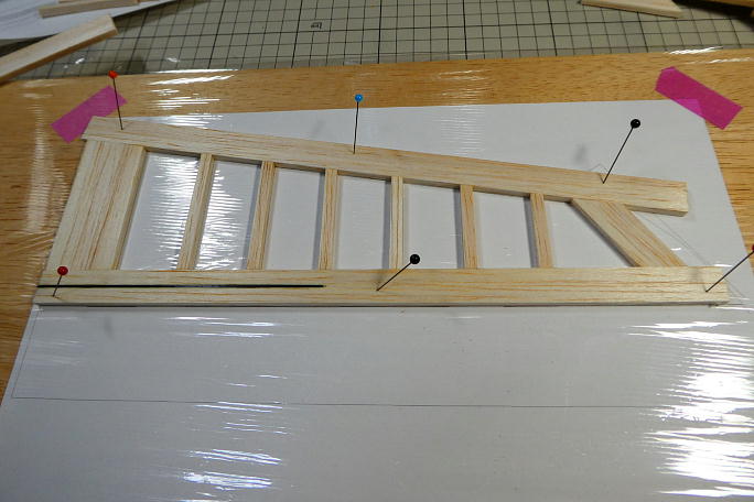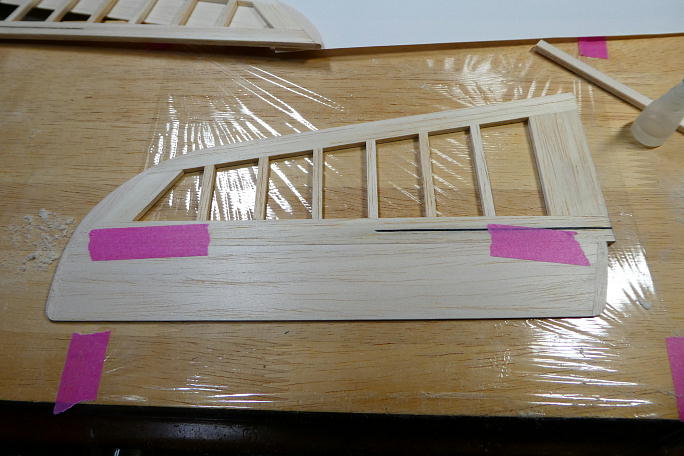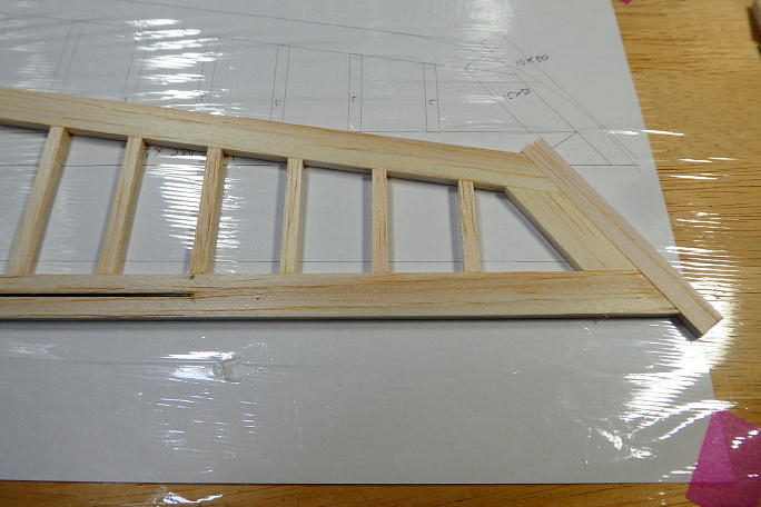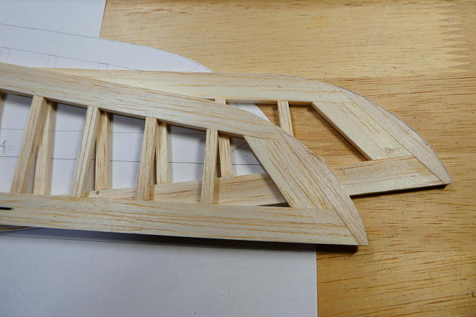 ![]() 図面の上で、切り出した部材を組んで行きます。 接着には低粘度瞬間接着剤です。 染みこみすぎる事でバルサの接着 には不向きと思われますが、硬化促進剤を上手く使う事でカッチリとした物が出来上がります。 ![]() 端面を整えてから木目の違う翼端材を接着します。 コレにより捻れ剛性が格段に上がります。 ![]() 組み立てに使った図面を型紙に、翼端の成型をします。 型紙があると左右の形を揃えるのが楽です。 ![]() 左右のV尾翼が出来上がりました。 ![]() 全体の段差、前縁の成型をしていきます。 同じ4ミリバルサでも厚みのバラツキが大きいので、段差取りは必須です。 出たバルサ粉は取っておきましょう。 いろいろと利用価値がありますよ。 ![]() 成型の終わった尾翼の断面です。 |