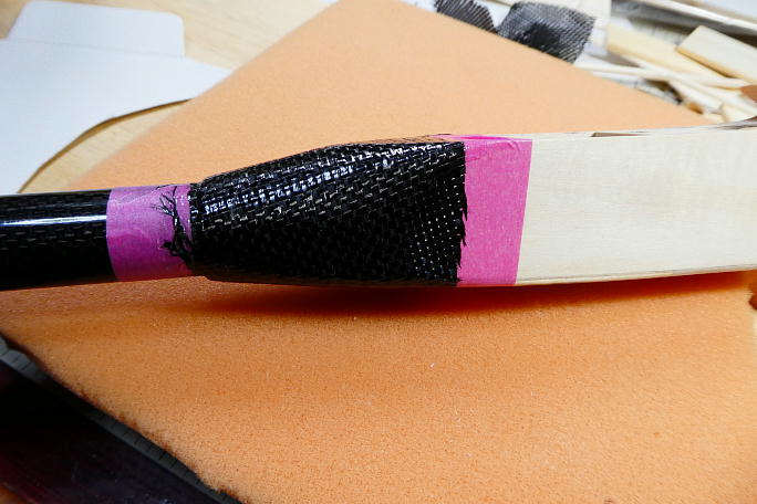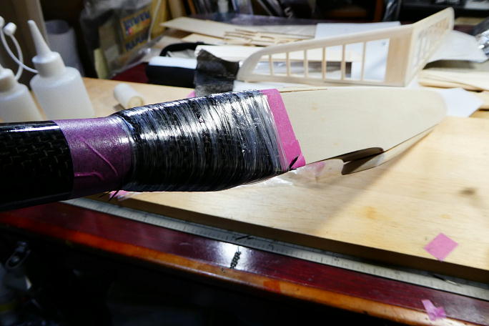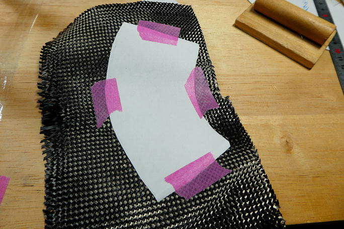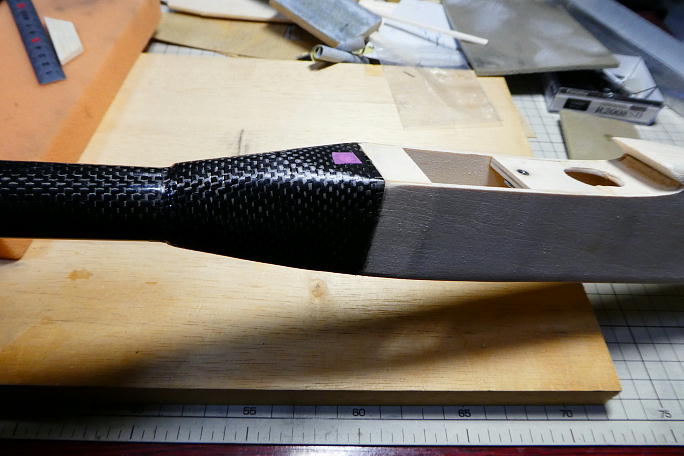 ![]() 胴体後部の旧ピメンタ胴体を巻き込んだ部分にカーボン補強をします。 胴体にコピー用を巻いて、補強部分の 型紙を作り、200g/dm2のカーボンクロスから補強部材を切り出します。 ![]() カーボンクロスに5052を染みこませ、胴体に乗せたら10ミリ幅に細く切ったストレッチテープでグルグル巻きにして 一晩硬化させます。 ![]() ストレッチテープを剥がした状態です。 ストレッチテープのデコボコがあります。 ![]() マスキングテープをガイドに、表面のデコボコを削っていきます。 縁がマスキングテープの厚みまでになれば、マスキングテープが剥がれると言う作戦です。 ![]() サンディング後、クリアラッカーで仕上げました。 |