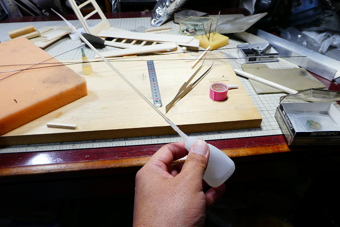 ![]() リンケージロッドは電動版ピメンタ同様1ミリカーボンロッドとポリイミドチューブの組合せです。 ![]() 接着前にポリイミドチューブの表面は硬化促進剤で拭いておきます。 ロックタイトの702を使っています。 白化してしまいますが、効果の持続が長いので、プライマーとしても使えます。 ![]() カーボンロッドの代わりに綱線をポリイミドチューブの中に通します。 ![]() テールパイプに綱線入りポリイミドチューブを通して、カーボンパイプの表面からネオジウム磁石で綱線を引きつけ、 借り固定します。 ![]() ノズルを延長した低粘度瞬間接着剤でパイプ内に瞬間接着剤を滴下します。 このサイズですと、5〜8滴程度 で全体に接着材が行き渡ります。 |