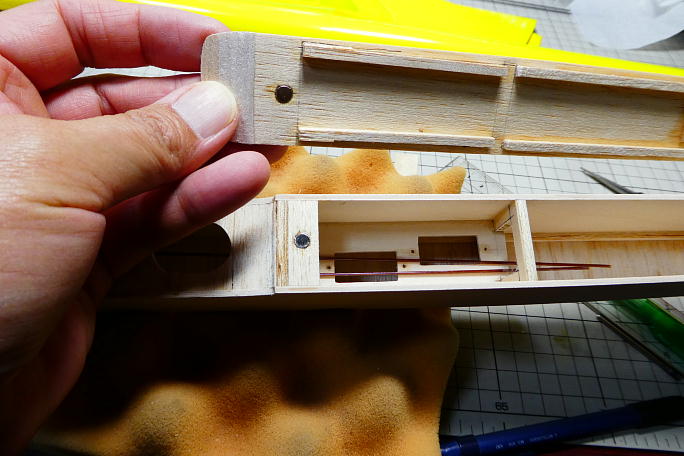![]() ハッチにはネオジウム磁石をロック用に使います。 少し彫り込んでからネオジウム磁石を瞬間接着剤で接着 します。 ![]() 胴体とハッチの両方に接着しました。 パチンと気持ち良く閉まります。 |