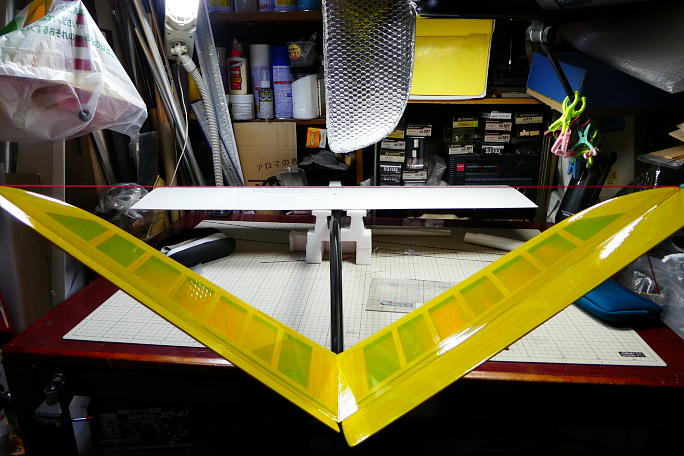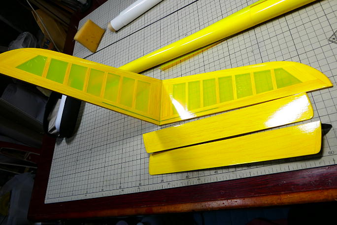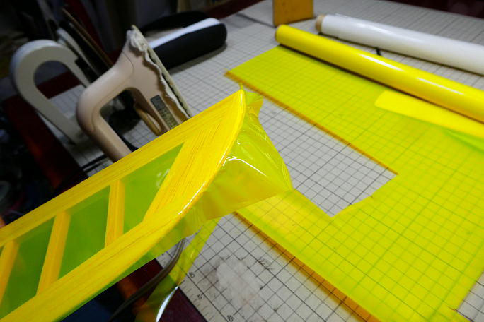 ![]() Vテールにフイルムを貼ります。 こちらに使用したのはOKのEライトフイルムです。 良く伸びるし、オラライトよりパリッとした 仕上がりになりますが、アイロンの温度は中〜高温を上手に使わないとシワになります。 ![]() フイルムの貼り終わったVテールです。 ![]() 胴体にもフイルムを貼ります。 こちらはOKのAフイルムです。 オラカバやモノコーテに当たる厚手のフイルムです。 こたらもアイロンの高温を使って貼っていきます。 ノーズ部分は充分に引っ張って先端のアールに馴染ませます。 ![]() フイルム貼り終わった胴体です。 |