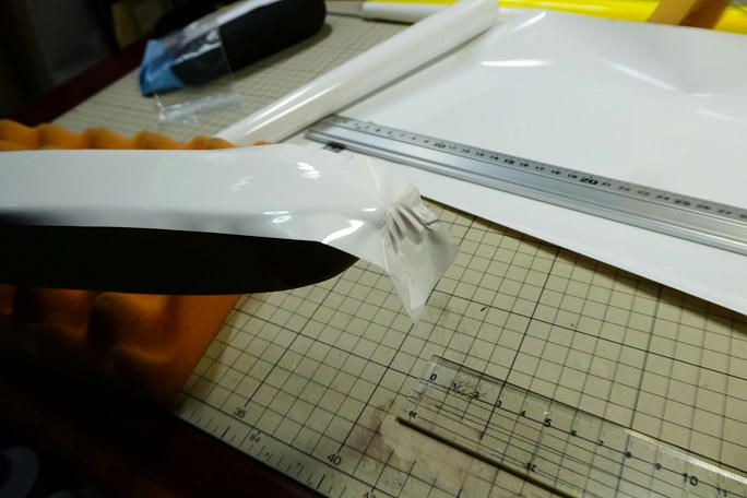 ![]() Vテールをマウントに接着する準備として接着部分のフイルムを剥ぎます。 Vテールにマウントをあてがってマウントの形をマーキングします。 ![]() マーキングに沿ってフイルムを切り取ります。 切り取った縁の部分はアイロンを当てて、接着を確実にしておきます。 |