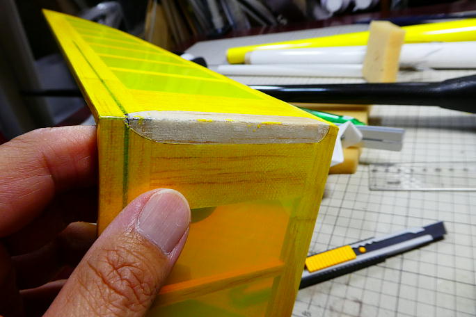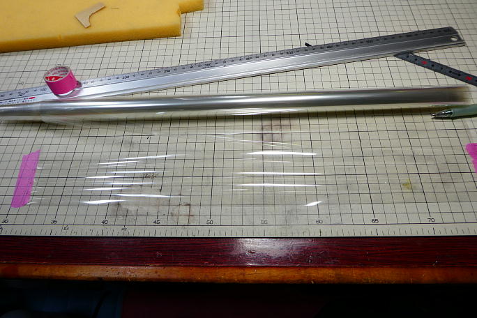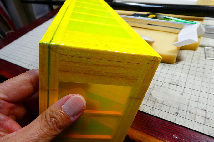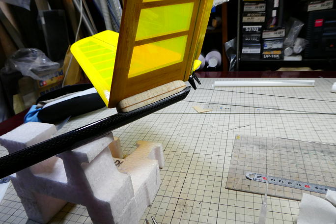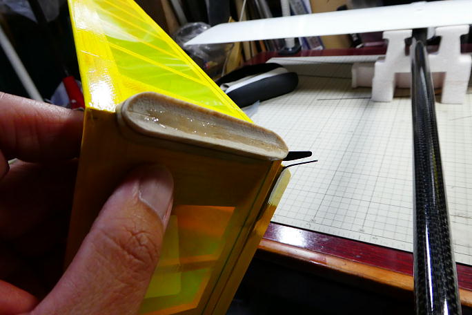 もう手に入らないのかも知れない、クラフトるうむのカバーリングフイルムです。 透明粘着フイルムに裏紙が付いた物です。 15ミリ幅に切って、テープヒンジにします。 ![]() ダウン側の最大舵角が取れる位置に細く切ったマスキングテープで動翼を借り固定し、裏返して裏面からテープヒンジ を貼っていきます。 ![]() 裏側が貼れたら、表のマスキングテープを剥がし、代わりにテープヒンジを貼ります。 ![]() テープヒンジが貼り終わったVテールです。 |