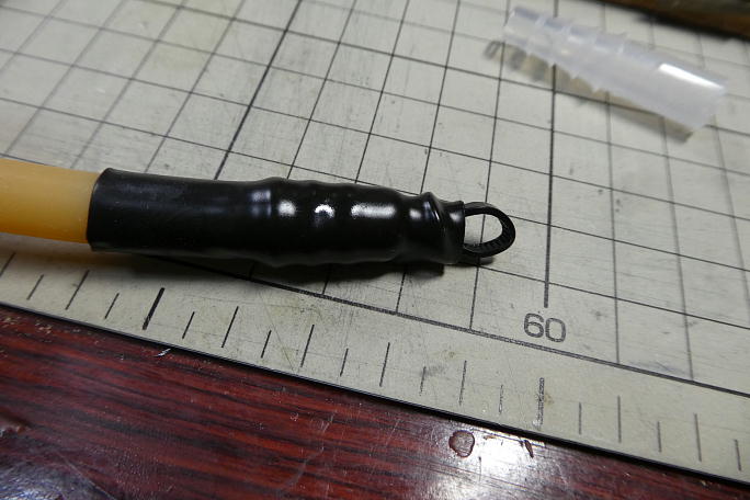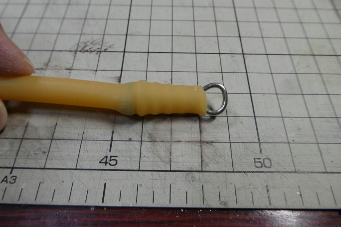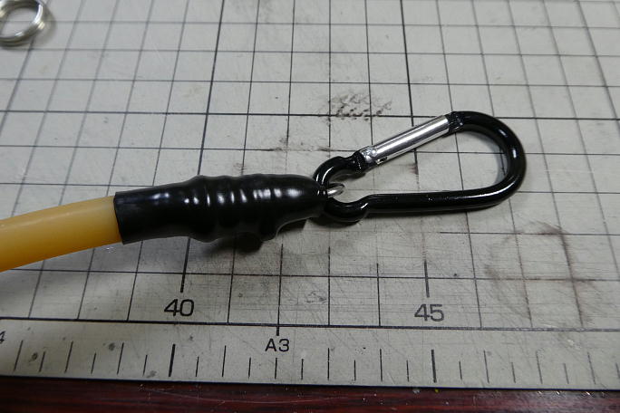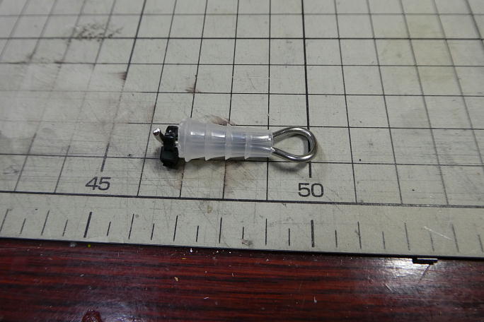 ![]() 1.5ミリのピアノ線でで作ったフックを入れて、抜け止めにタイラップを巻きました。 ![]() ゴムチューブの中に押し込みます。(撮影用に飴色のゴムを使っています) ![]() 一カ所、ゴムの上からタイラップで縛って、シュリンクチューブを掛けてシュリンクさせれば完成です。 こちらはペグ側。 こちらはライン側です。 軽量化の為にピアノ線ではなく、縛ったタイラップを後ろから押し込んだだけです。 ![]() ルールでは、ラインは0.7ミリ以上とあり、20号相当になります。 釣り具屋で探すとラインがかなり高価だつたのですが、 ネットで探したところ、ポップなどを吊す汎用のテグスがありました。 長さは丁度100メートル、お値段も650円とお手頃です。 |
