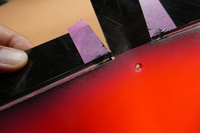 ![]() ![]() 厚み補正でFRP板を接着していますが、それでもポケットとエルロンホーンとの間に隙間が出来ます。 このままで 飛ばしている人もいますが、どうしても支えの無いエルロン上面が窪んできてしまいます。 それを防止する為にエルロンホーンとエルロン上面スキンとの隙間にカーボンパウダー入り5分エポキシを充填 します。 |