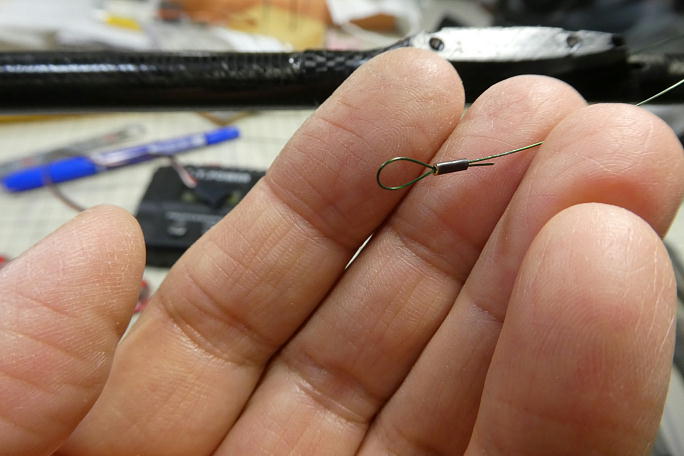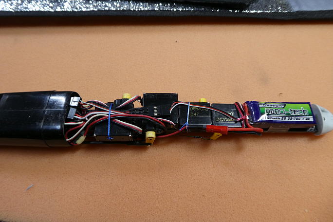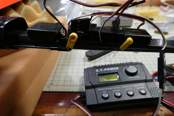 ![]() エレベーターリンケージの尾翼側は引っかけるだけなので、先に輪を作っておきます。 付属のスリーブは長すぎるので カッターで転がしながら半分に切ります。 ニッパーの刃先で溝を刻むように押しつぶします。 後で瞬間接着剤を染みこませておきます。 ![]() サーボのニュートラルを確認しながら、ワイヤーの輪の部分の伸びを考慮して、少しだけ引っ張り気味にしてニッパーの 刃先でスリーブを潰して固定します。 スリープの周囲を瞬間接着剤で固定しておきます。 ![]() エルロンホーンはこのホーンしか選択肢がありません。 穴が大きいのでピアノ線ではガタが出てしまいます。 ![]() リンケージのカーボンパイプとエルロンホーン側のロッドを組み立てます。 ロッドの接着部はサンディングの上に脱脂が してあります。 ロッドに5分エポキシをまとわせてカーボンパイプに差し込みます。 出口周辺を瞬間接着剤で固めておきます。 ![]() エルロンサーボは130μs分ニュートラルをずらし、1ノッチ分サーボホーンをオフセットしておきます。 カーボンロッドのロッドエンドにはマイクロクレビスを使用しました。 マイクロクレビスはピンが1ミリ径なので、サーボホーンに丁度良いようです。 マイクロクレビス瞬間接着剤が効きますのでニュートラルを合わせたら低粘瞬間接着剤で固定します。 ![]() コード類を束ねて完了です。 添付品のバッテリーが死んでいたので、手持ちのバッテリーを使いました。 |