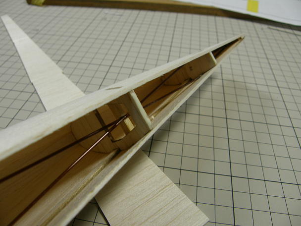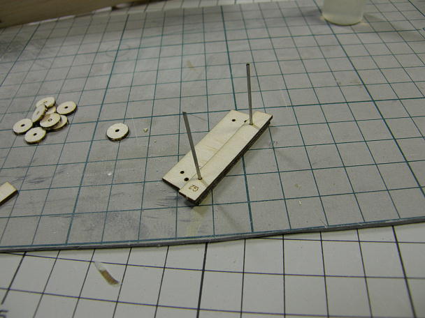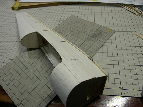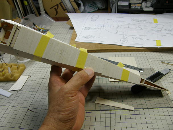 ![]() メインギヤのマウントを作ります。 2ミリベニヤの積層です。 穴の位置を合わせる為に1ミリのピアノ線を刺し ます。 ![]() ネジ受けも2ミリベニヤを積層してタワーにします。 こちらもピアノ線で位置決めをします。 ![]() 出来上がったタワーを接着しました。 フライトした経験から、メインギヤマウントの接着面積が少ないので、ラフなランディングでマウントごと持って 行かれる事がありました。 何かしらの補強が必要と感じました。 ![]() ![]() 下面プランク材を仮止めして、プランク材の組合せを決めます。 二本線を書いてアイマークとします。 ![]() タイトボンドで貼り合わせて1枚のプランク材にしておきます。 ![]() 側板と胴枠のツラをサンディングで合わせておきます。 内部はこれで見納めです。 ![]() 接着か完了した下面プランク。 トリミングした後、サンディングしました。 |