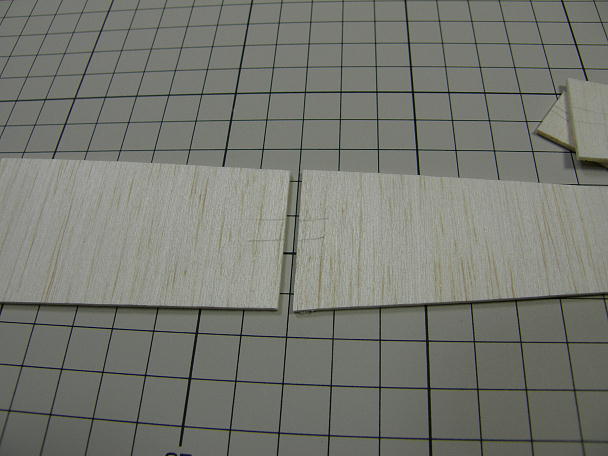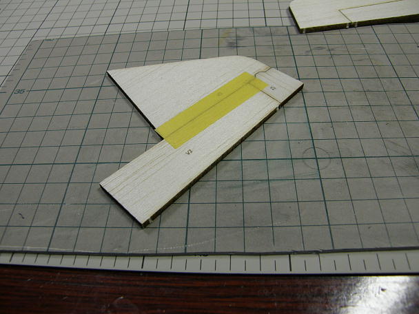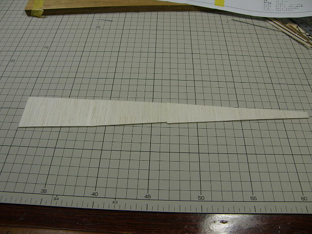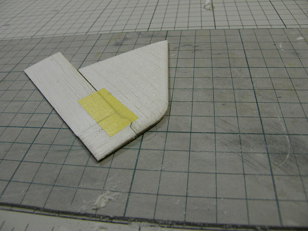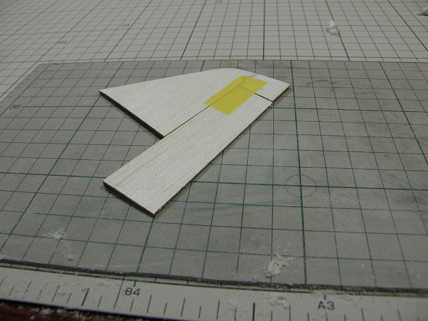 ![]() 垂直尾翼は3枚のパーツから成ります。 くさび状の整形などはしてありませんので、自分で削ります。 ![]() ラダー部分をくさび状に整形します。 前縁も整形。 ![]() 上部も一連の流れになるように整形します。 |