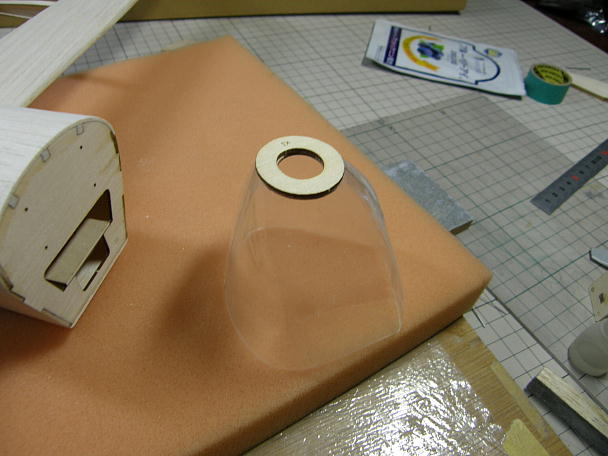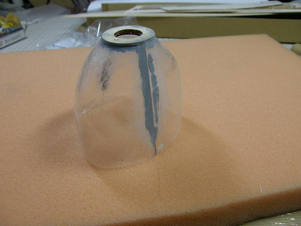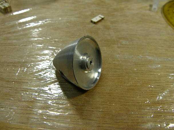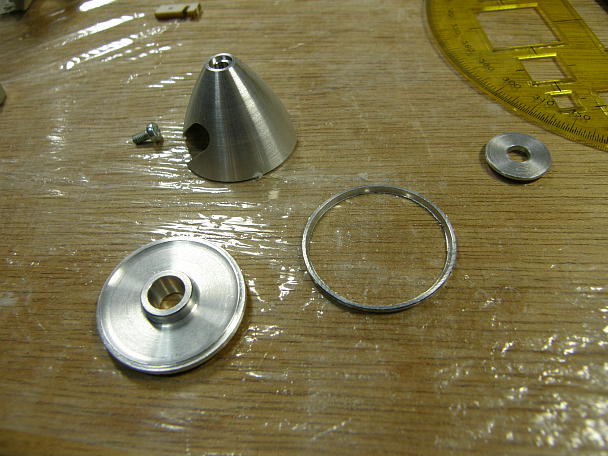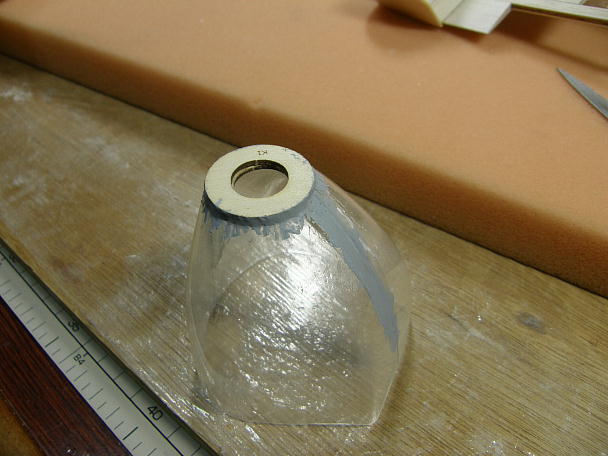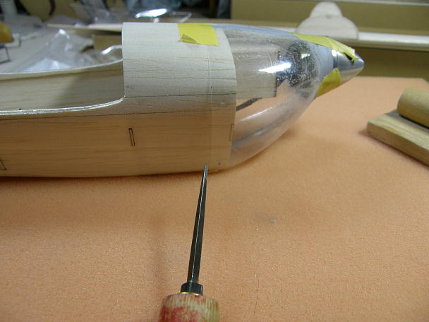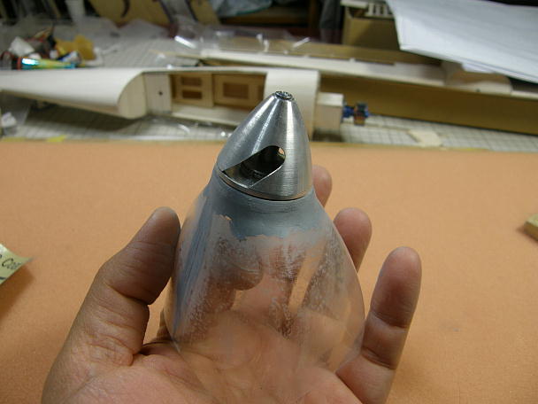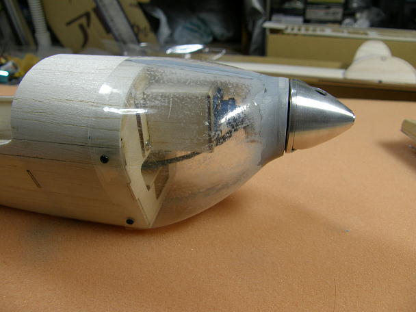 ![]() カウルを作ります。 カウルは極薄の塩ビ素材をシュリンクさせて作られています。 キットには左右分割で同封 されています。 少し大きめにカットされているので、胴体のラインに合わせてカット、5ミリ程重ねて瞬間接着剤で接着します。 1.8ミリベニヤのリングを外と中から挟んで接着します。 合わせ目の段差とリング回りの隙間を埋める為にパテを盛ります。 ![]() 耐水ペーパーで不要なパテを研ぎ落とします。 ![]() 用意したのは30ミリのスピンナーで、2ミリのコレットがセットになった物です。 カウルに接着したリングの外径 は25ミリで、このままですとスピンナーが2.5ミリずつカウルからはみ出す計算です。 ![]() スカイチョビイの製作の時にもやった工作例ですが、スースピンナーのスカート部分を切り離して外径を押さえる 手法を今回も採ってみます。 スピンナーを電動ドリルで咥えて回転させ、回転させたリューターの切削砥石を当てて切り込みます。 ![]() 切り離されたスカート部分と成型したスピンナー。 27ミリ弱まで外径が小さくなっています。 ![]() スピンナーに合わせる為、カウルのリング回りに更にパテを盛り上げ、成型します。 ![]() モーター、スピンナーを仮止めして、カウルの位置決めをします。 カウル取り付けネジの下穴を開けます。 ![]() 1.7ミリタッピングねじ4個で固定します。 |