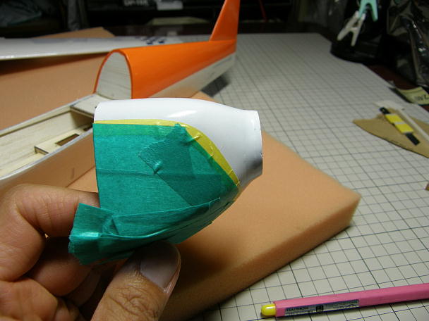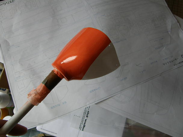 ![]() ホワイトサーフェーサーをを塗った上にホワイトで塗装します。 オレンジで塗り分けをするラインをマスキング します。 ![]() オレンジで塗装します。 ミッチャクロンも使えば良かったと反省です。 |