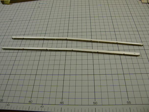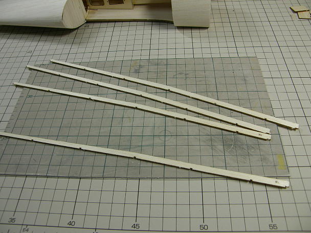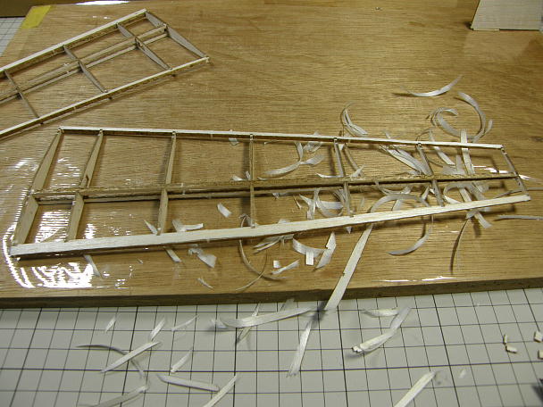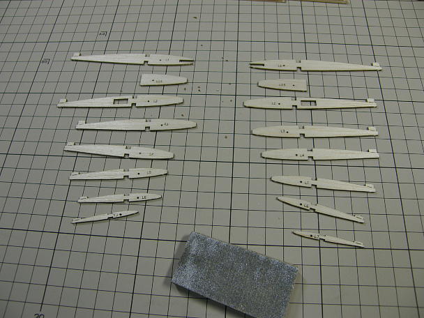 ![]() 前縁材と後縁材を作ります。 レーザーカットされた3ミリバルサ、2枚を貼り合わせて厚みを作る方式です。 ![]() タイトボンドを薄く塗って貼り合わせ、重しを掛けて一晩放置します。 タイトボンドの水分でもれなく捻れてきます。 出来上がった前縁材と後縁材です。 |