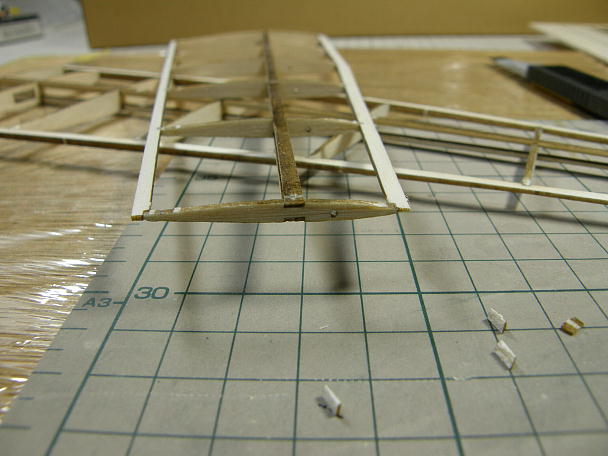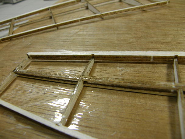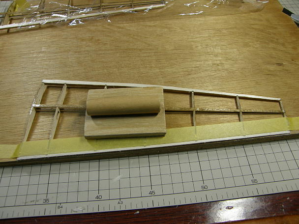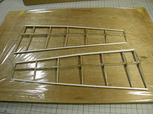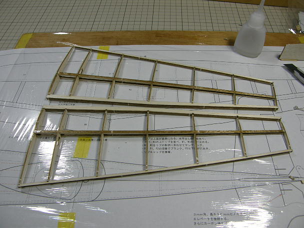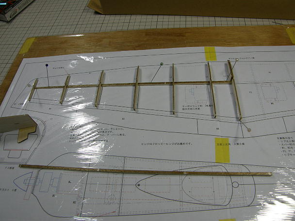 上下スパーの間にウエブ材を挟み込んで接着します。 主翼が捻れないようにマチ針で定盤に固定した状態で 接着します。 |