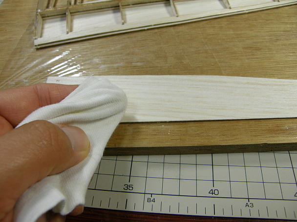 ![]() プランク材の表面の荒れは接着前に整えておきます。 プランク後にガシガシ削ると、どうしても波打ってしまう ので、事前に削っておくことで波打ちを押さえます。 ![]() 上面プランクも瞬間接着剤で行います。 低粘度瞬間接着剤をリブに染みこませておき、硬化後に高粘度 瞬間接着剤盛って、プランク材を被せます。 プランク材の接着面には硬化促進剤を含ませたウエスで拭いておきます。 これにより、接着が素早く確実に なります。 ![]() プランクの終わった主翼です。 |