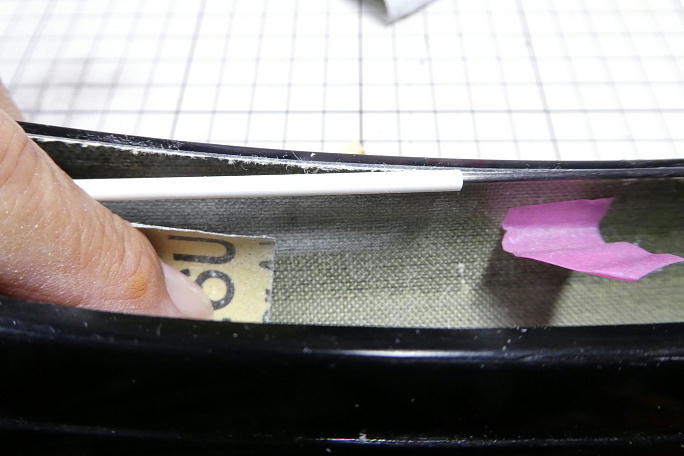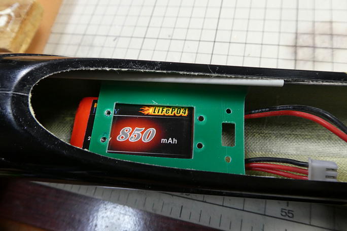 ![]() サーボベッド、受信機バッテリーベースの接着前に、胴体内壁をサンディングして足付けをしておきます。 この機体は内壁 にケブラーが貼ってあるので、あまりしつこく削ると毛羽だってしまい収集が付かなくなります。 程ほどで止めておきます。 ![]() 先に受信機バッテリーベースを瞬間接着剤で接着します。 この機体はサンデーユースメインなので受信機バッテリーを 積んでいますが、競技を視野に入れているのであればBECをお勧めします。 容量が5A以上あればBECでまかなえますし、150グラムは軽量化出来ます。 ![]() 受信機バッテリーはサーボベッドの下を通って指定の位置にたどり着くので、バッテリーのサイズを参考にサーボベッドを 瞬間接着剤で仮接着します。 ![]() しっかり瞬間接着剤を流して本接着をした後、マスキングをしてカーボンパウダー入り5分エポキシ盛ってフィレットを 作ります。 ![]() サーボを外さない限り日の目を見ることが無くなる受信機バッテリーの充電コードは、延長コードを取り付けて、接合部 には抜け止めにシュリンクチューブを掛けておきます。 |