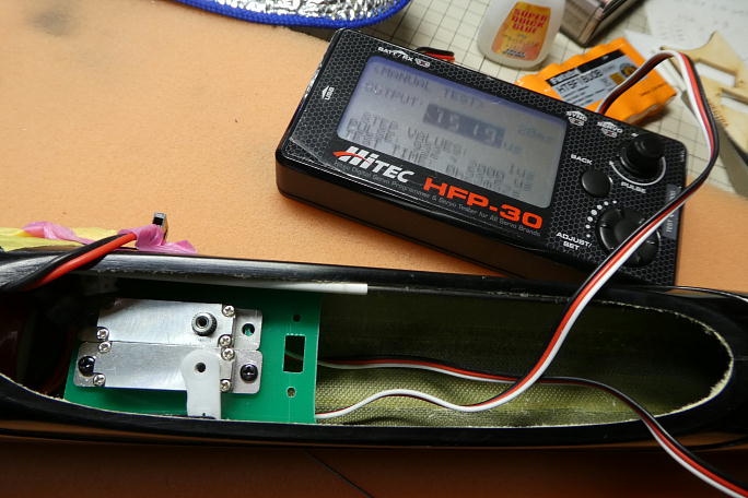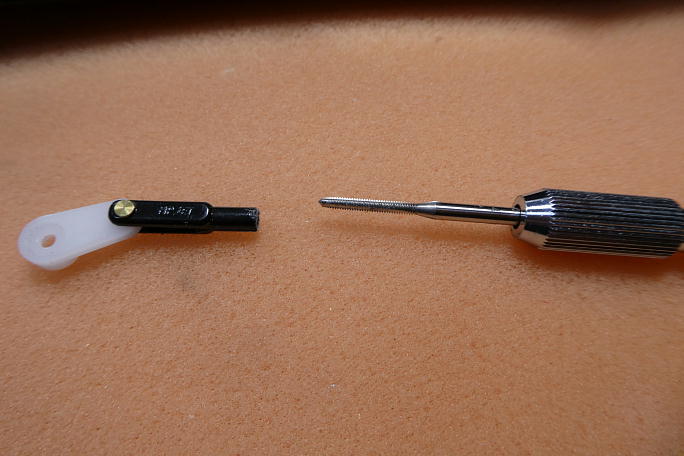 尾翼のリンケージには1ミリピンのマイクロクレビスを使います。 そのままではアジャスターがとても渋いので、M2の タップを立てて予めネジを切っておきます。 ![]() クレビスを組み込んだエレベーター用のサーボホーンです。 エレベーターホーンはレバー長が35ミリもあり、舵角不足が 懸念されるので、サーボホーンにクレビスの逃げを加工して、サーボの最大動作角に対応させます。 ![]() ![]() エレベーターのニュートラルを出してリンケージのカーボンロッドをカット。 アジャスターを接着する部分をサンディング しておきます。 サンディング後に硬化促進剤を塗っておきます。 ![]() ![]() サーボのニュートラルを出して、アジャスターとカーボンロッドを瞬間接着剤で接着します。 ホーンと内壁がギリギリです。 |